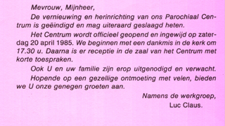 Op aandringen van E.H. Claus werd begin de jaren tachtig de vzw Parochiale werken uitgebreid met afgevaardigden van de huisverenigingen die toen zonder lokaal vielen. Deze nieuwe groep mensen was de drijvende kracht achter de verbouwingen. De plannen werden gemaakt en in mei 1983 kon er gestart worden met de renovatiewerken. Als financiering werden renteloze obligaties met terugbetaling op 10 jaar uitgegeven en de parochiefeesten werden opnieuw georganiseerd ten voordele van het centrum.