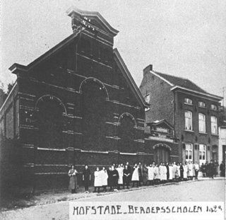 In 1915 kwam hier pastoor Kamiel Michiels. Aan zijn werking dankt Hofstade zijn bloeiende vakschool. Inderdaad in 1920 werd een Naai – en Snijschool geopend in de ‘patronage’, die in 1923 werd overgebracht naar de nieuwe lokalen ernaast. Deze school telde voor het schooljaar 1947 – ‘48 niet minder dan 105 leerlingen uit Hofstade en omliggende gemeenten.