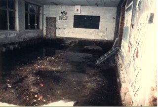 Einde de jaren zeventig raakte alles in verval, zo erg zelfs dat een steun midden in de grote zaal moest voorkomen dat het dak instortte. Onder de houten vloer van de huidige inkomhal en keuken was het een stinkend moeras.